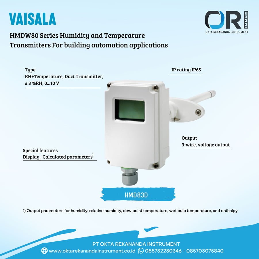 Vaisala HMD80 Series Duct-Mount INTERCAP® Humidity and Temperature Transmitter is optimized for easy installation in HVAC and building automation applications. With an adjustable insertion depth, the transmitter is well suited to various duct sizes.